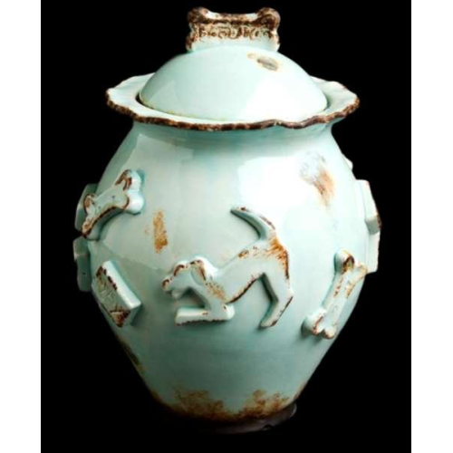 Don't forget your furry, 4-legged family members! Our dog treat jars with matching bowls add to the decor of your kitchen or dining room. All are durable stoneware with a rubber gasket inside the lid to keep air out and treats fresh. Hand decorated with raised appliques all around the vessel. Available in Baby Blue, Aqua/Green, French White and Caramel. Measures 7 1/2" to the rim, 9 1/2" to the "Good Dog" cookie on top and about 7" wide Thank you for shopping at noahsarkpetsupply.com