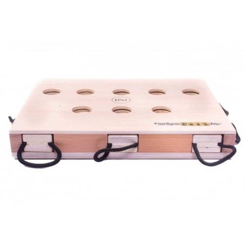 Length: 14.00 Width: 10.00 Height: 1.00 Length: 14.00 Width: 10.00 Height: 1.00 iPet - Smart Dog is a dexterity game for dogs. It has a difficulty grade of 4 Paws. The game is a simple binary computer made of wood in the shape of a laptop. Attached to each of the game's four sides are eight pull-out plates with openings for treats. Individual plates are blocked by other plates, so that they need to be pulled out in predefined order. Once the dog has solved all tasks correctly the display on the top shows Smart Dog. "iPet(R)" is recommended for dogs' mental activity. As highly intelligent animals they need an appropriate balance to physical activity (walking, running, agility), otherwise their mental abilities are not challenged sufficiently. This can lead to unwanted behaviour by the dog: aggression, separation anxiety, frustration, destructiveness, restlessness or impatience. This game trains a dog's concentration and dexterity, and encourages its natural instincts of curiosity, drive to play and sense of smell. Your dog will love to see you set up the game as it can prove itself to you. This will strengthen the bond between you and your dog as well as its self-confidence. These intelligence games are a meaningful and appropriate activity for dogs that is recommended by trainers and veterinarians. How to play: 1. Hide your dog's favourite treats in the plates' indents and under the pieces on the game's top surface. Let the dog watch as you set up the game in order to stimulate its curiosity. 2. Encourage your dog to start searching. Be patient and show it how the game works. For instance, you could show it where a treat is waiting for it, and the order in which it has to solve the problem. This way you can make sure that your dog enjoys playing the game together with you and can solve the task. 3. Initially do not use the pieces. Increase the level of difficulty by adding the pieces on the game's top surface only when your dog can solve the initial problems without any difficulty. That way your dog is constantly dealing with new challenges, and the game provides a meaningful and appropriate activity that it enjoys. The game should always present your dog with challenges it can solve. If after a few attempts the dog cannot solve the puzzle it may lose motivation, so if the game is too difficult for your dog, try other games with a lower grade of difficulty first. Never let your dog play unsupervised, and intervene if it starts to chew pieces of the game. Regularly check the pieces for any damage such as splinters. Clean by wiping with a damp cloth, and do not use abrasive cleaners. Additional information "iPet(R)" is made of certified wood covered in a water-based varnish that is not harmful to humans and animals. Please keep the game dry and free of water, as the wooden pieces may swell otherwise. Use only dry treats when playing "iPet(R)-Smart Dog". "iPet(R)" is not a toy for children! My Intelligent Pets(R) games are protected by several international patents as well as name, brand, design and copyright laws. Enjoy playing! Thank you for shopping at Noahsarkpetsupply.com