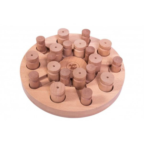 Mandala & Star This puzzle contains two games in one - you can easily choose which puzzle to play by turning it over. In "Mandala" (difficulty level 2 paws) straight and curved tracks which guide the "hats" where treats are hidden are placed symmetrically, while in "Star" they form the shape of a star. The game trains dog's dexterity and concentration skills while boosting their natural instincts of curiosity, drive to play and sense of smell. We recommend this game for the beginners in field of intelligent games activities for your pet. According to dog's behaviorists 10 minutes of mental stimulation with employment of interactive game equivalents to 1 hour of physical exercise. This is especially important for the dogs living in large cities where long walks are difficult and impossible , senior dogs with ailments that do not allow them for prolong outings and those living in cold climates, where going outside can put animal's health at risk. How to play: 1. Hide your dog's favorite treat under "cylinders" and "hats" and then place them in the tracks. Make sure your dog sees you placing the treats inside of the puzzle pieces. 2. Encourage verbally the dog to start the search or if necessary show them the treat hidden under the "cylinder" and "hat". 3. The treat will be found under the "cylinder" any knocking it down with a paw or a nose and in case of the "hat" by moving it in its track to the position where the "hat" can be lifted revealing the treat. 4. Don't forget to praise your dog every time he finds a treat. Additional information: Dimensions : 12"x5"x4" Weight: 4lb All our games and puzzles are made from certified wood covered in a water-based varnish that is not harmful to humans and animals. Please keep the game dry and free of water, as the wooden pieces may swell otherwise. Use only dry treats for playing "Dog' SUDOKU(R)". Keep out of reach of small children since removable parts can be a choking hazard to them. Thank you for shopping at Noahsarkpetsupply.com