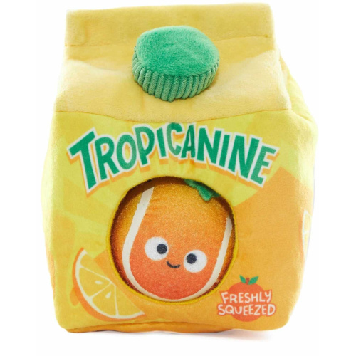 This BARK orange juice dog toy is ripe for the playtime picking. Fresh Squeaked OJ is a 2-in-1 toy with a squeaky tennis ball perfect for biting, squeezing, fetching, and catching. The plush carton is packed with Vitamin C! (That stands for crazy crinkle.) Hide some treats inside for a refreshing game of hide n squeak. Made by dog people, for dogs and their people, backed by BARK's Happiness Guarantee.