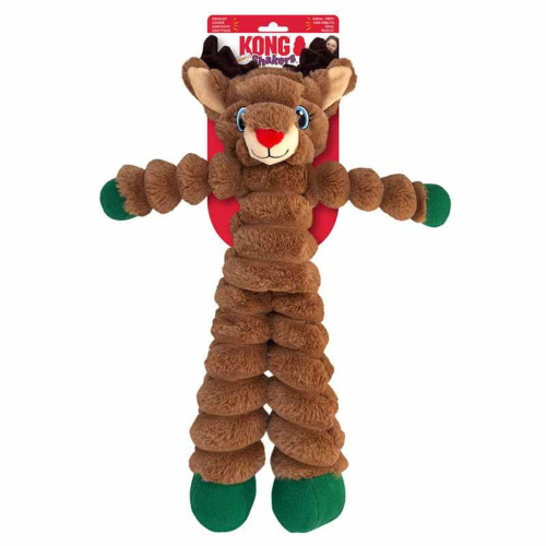 KONG Holiday Shakers Crumples Reindeer's jumbo size body delivers extra-large holiday fun with a long, floppy body great for satisfying shaking, tugging, and fetching instincts. A unique grunting squeaker in the body, crackly arms, and squeaky feet keep dogs playing. Irresistibly soft plush makes this reindeer a fantastic snuggle buddy this season. The perfect toy for every dog large or small, naughty or nice.